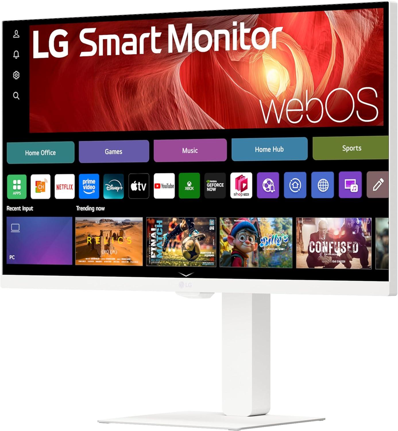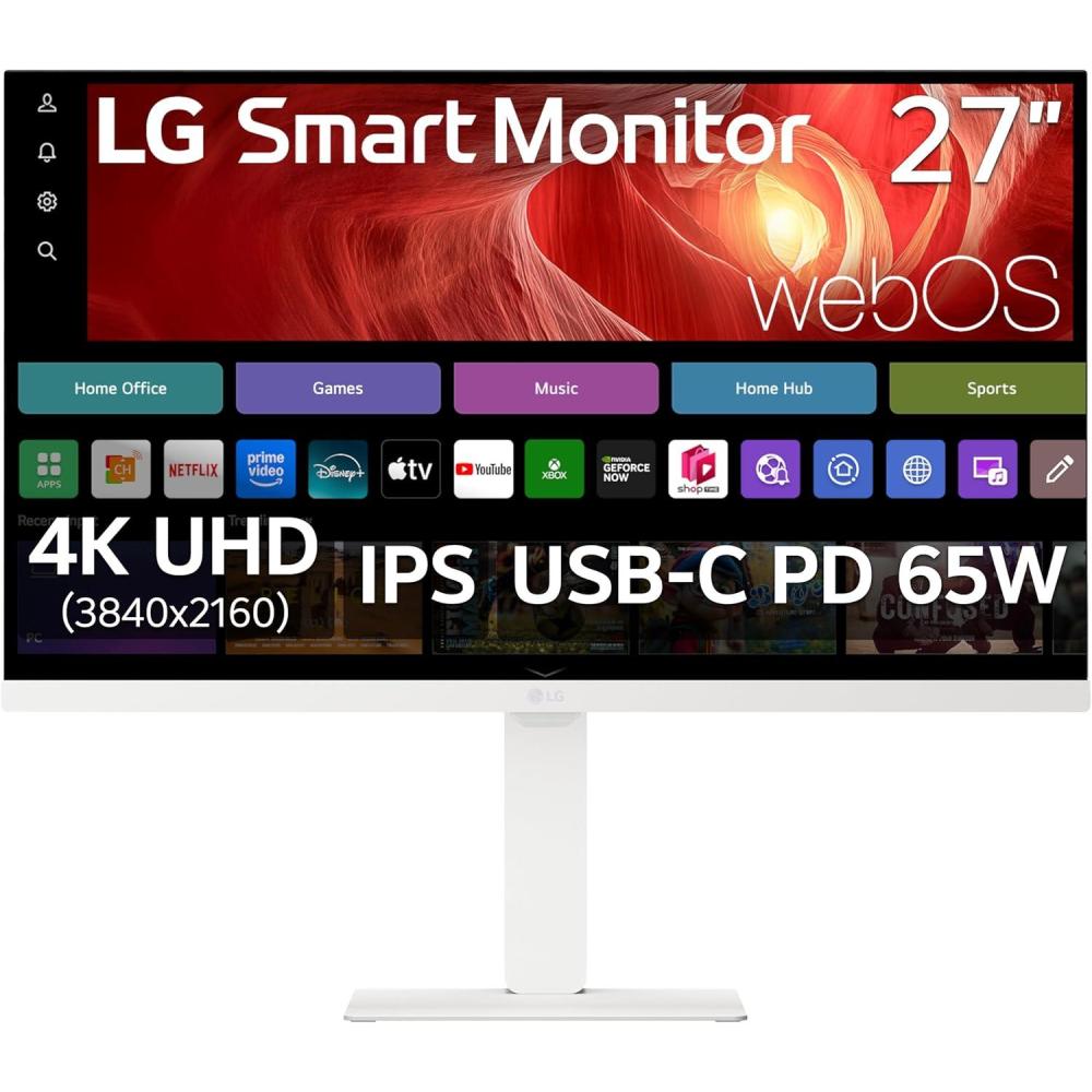 One screen, endless possibilities with the LG monitor. The 27″ 4K UHD IPS Smart Monitor offers stunning visuals and a sleek design that's perfect for work, play, and everything in between. Experience vivid clarity with a resolution of 3840 x 2160, bringing every detail to vivid life. Its slim design and flat style stand will stylishly blend into your desktop. With LG’s webOS23¹ built-in, easily access your favorite streaming apps like Netflix, Prime Video, the Apple TV app, Disney+, and HBO Max. Plus, get instant access to over 300+ free LG Channels with everything from comedy to movies to sports. Apple AirPlay 2 & HomeKit compatibility⁴ allow you to wirelessly control your monitor plus cast and mirror content from iOS or MacOS devices, no Apple TV necessary. With two HDMI ports and three USB ports (2 upstream / 1 downstream) and a USB Type C connect with confidence knowing your devices will be compatible with this display. Smart Monitor is all about the possibilities. ¹Internet connection and subscription to streaming services are required. ²Home Office services support only Microsoft 10 and 11 or higher. Microsoft 365 and Google registration and subscriptions may be required. Separate services may require payment for subscription. Supported service may vary by country. ³Internet connection and subscriptions to streaming services are required. Amazon, Prime Video and all related logos are trademarks of Amazon.com, Inc. or its affiliates. Amazon Prime membership and/or Prime Video fees apply. See primevideo.com/terms for details. HBO Max 2023 Warner Media, LLC. All Rights Reserved. HBO Max is used under license. Number of LG Channels subject to change. ⁴Your Apple device must be connected to the same Wi-Fi network as your monitor. Apple, the Apple logo, AirPlay, Apple TV, and HomeKit are trademarks of Apple Inc., registered in the U.S. and other countries. This LG Smart Monitor supports AirPlay 2 and requires iOS 12.3 or later or macOS 10.14.5 or later. Internet connection and subscriptions to streaming services are required for streaming services. ⁵USB Type-C cable not included.