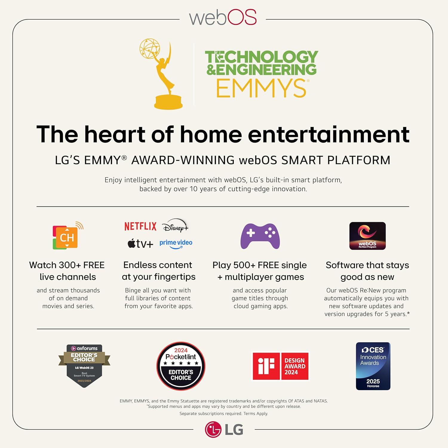 ¹Source: Omdia. Unit shipments, 2013-2024. Results are not an endorsement of LG Electronics. Any reliance on these results is at the third-party’s own risk. ²Image quality of upscaled content will vary based on source resolution. ³Dolby, Dolby Vision, Dolby Atmos, and the double-D symbol are registered trademarks of Dolby Laboratories Licensing Corporation. Manufactured under license from Dolby Laboratories. Confidential unpublished works. Copyright 2012–2025 Dolby Laboratories. All rights reserved. ⁴PC with 144Hz graphic card required. ⁵Internet connection and subscriptions to streaming services are required; number of LG Channels subject to change. Software update will automatically download. Consumers who disable “auto-update” will receive a pop-up notification to accept or deny software update. ⁶Google is a trademark of Google LLC. Google Assistant is not available in certain languages and countries. Apple, the Apple logo and HomeKit are trademarks of Apple Inc., registered in the U.S. and other countries. ⁷Subscription and compatible gaming controller are required.