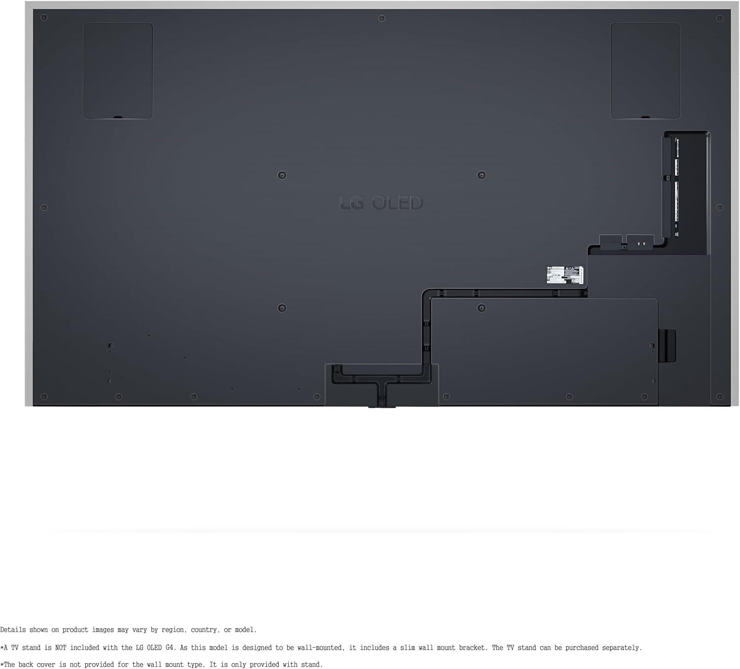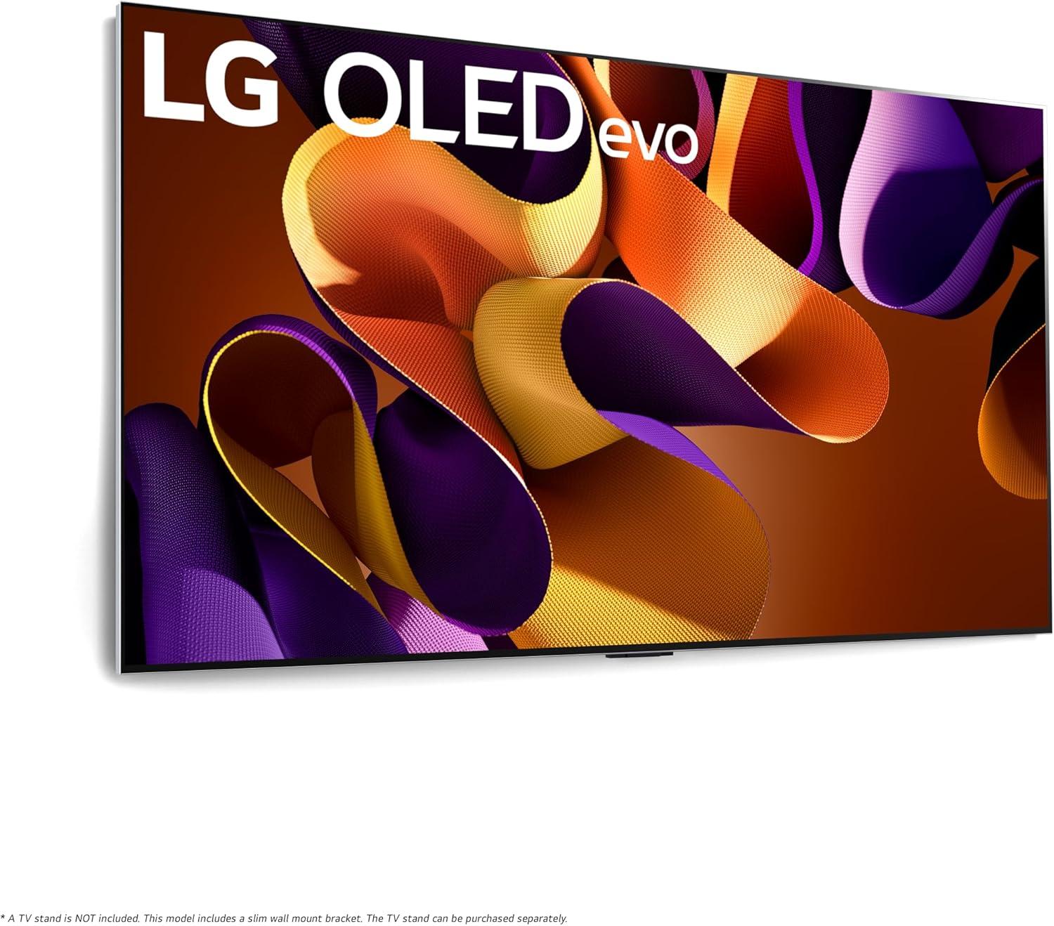 **Based on LG internal testing: 55/65/77/83″ LG OLED evo G4 models with Brightness Booster Max are 150% brighter than the Peak Brightness of OLED B4 models.**Depending on installation environment, there may be a slight gap between the TV and the wall. Installation requirements vary. See installation guide for details.***Internet connection and subscriptions to streaming services are required; number of LG Channels subject to change. ****Dolby, Dolby Vision, Dolby Atmos, and the double-D symbol are registered trademarks of Dolby Laboratories Licensing Corporation. Manufactured under license from Dolby Laboratories. Confidential unpublished works. Copyright 2012–2024 Dolby Laboratories. All rights reserved. *****In the 1st year of the warranty, panel, parts and labor costs are covered. In the 2nd-5th year of the warranty, only panels are covered, and labor will be charged. The 5-year limited panel warranty is available for the G, Z & M Series.