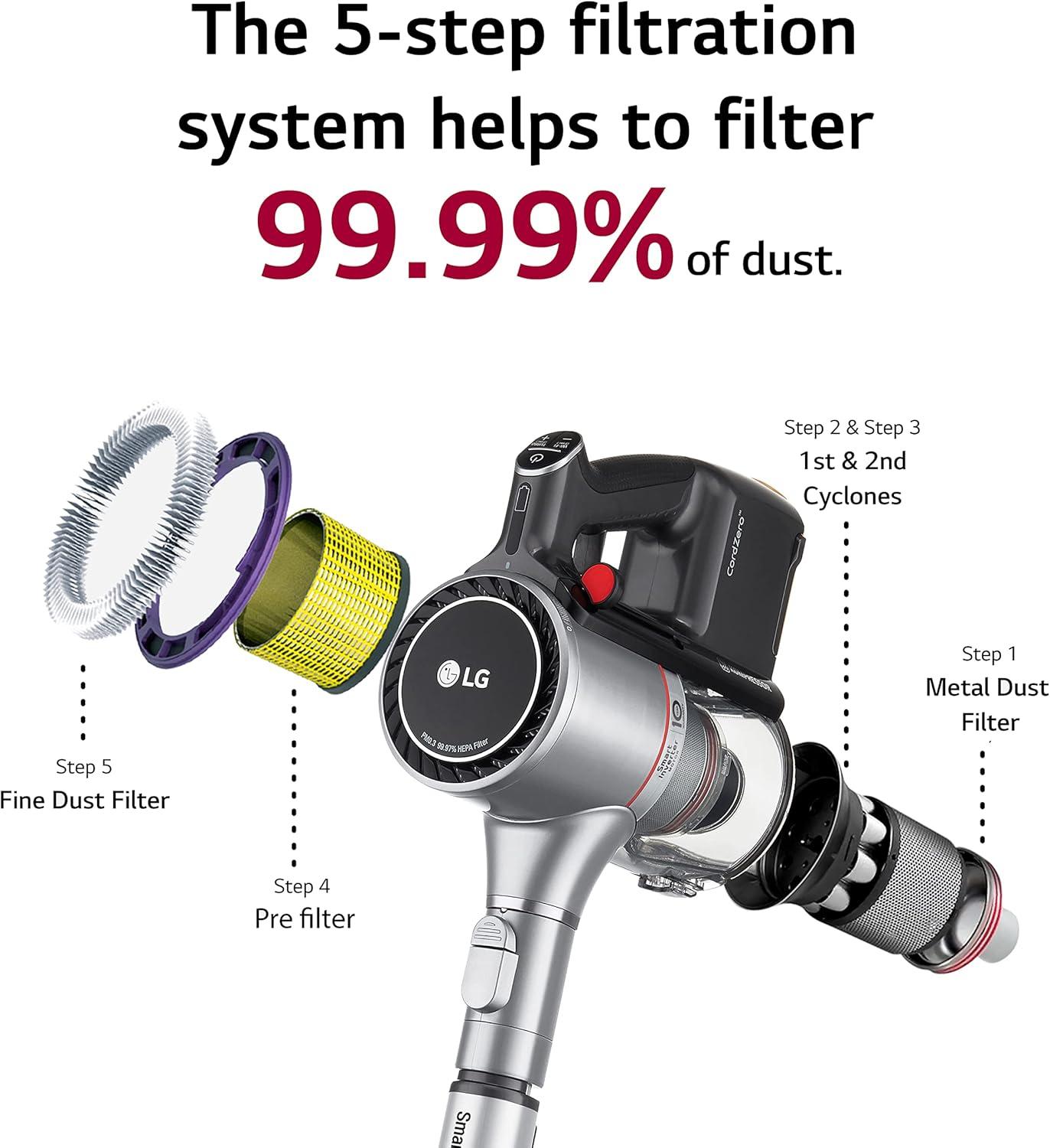 REMOVABLE, WASHABLE CYCLONE AND FILTERS: Extend the life of your vacuum with easy to maintain removable and washable filters. Unlike other vacuums that only let you remove the filter, LG CordZero lets you remove both the filter and the cyclone system to clean away dirt and keep your vacuum running at its best.