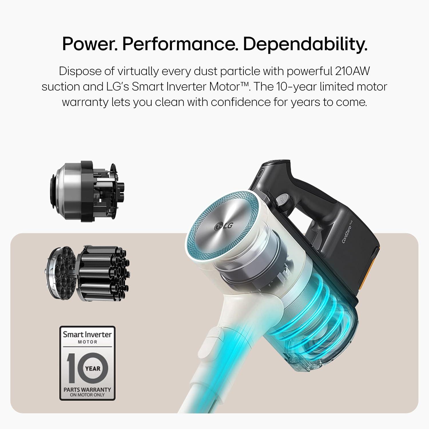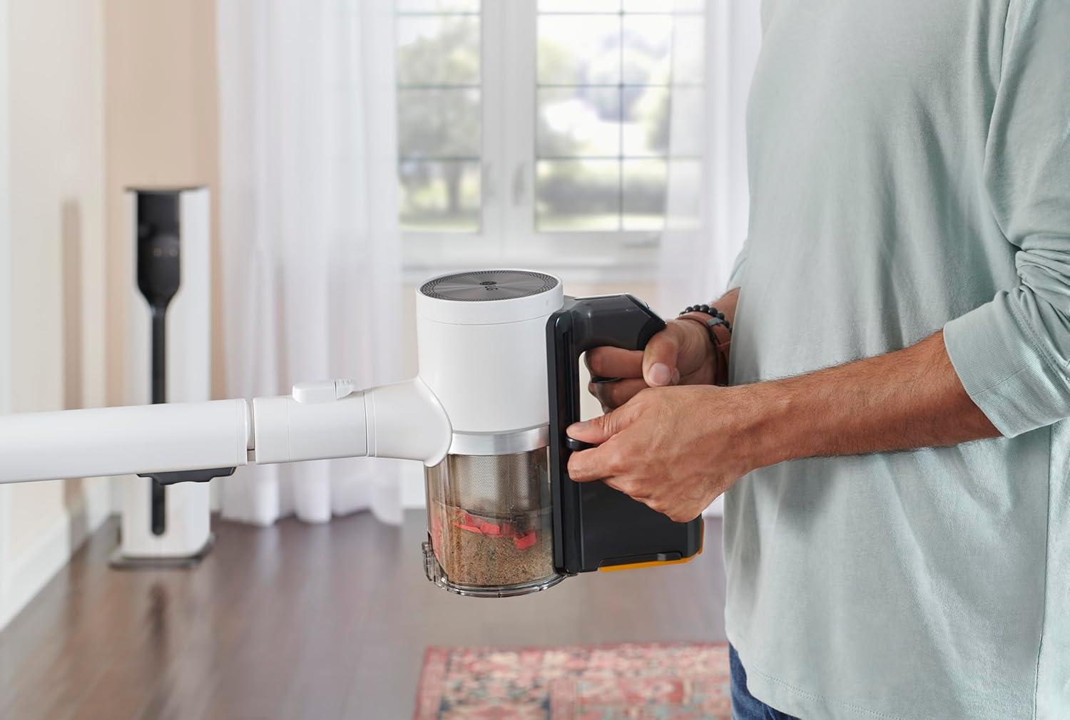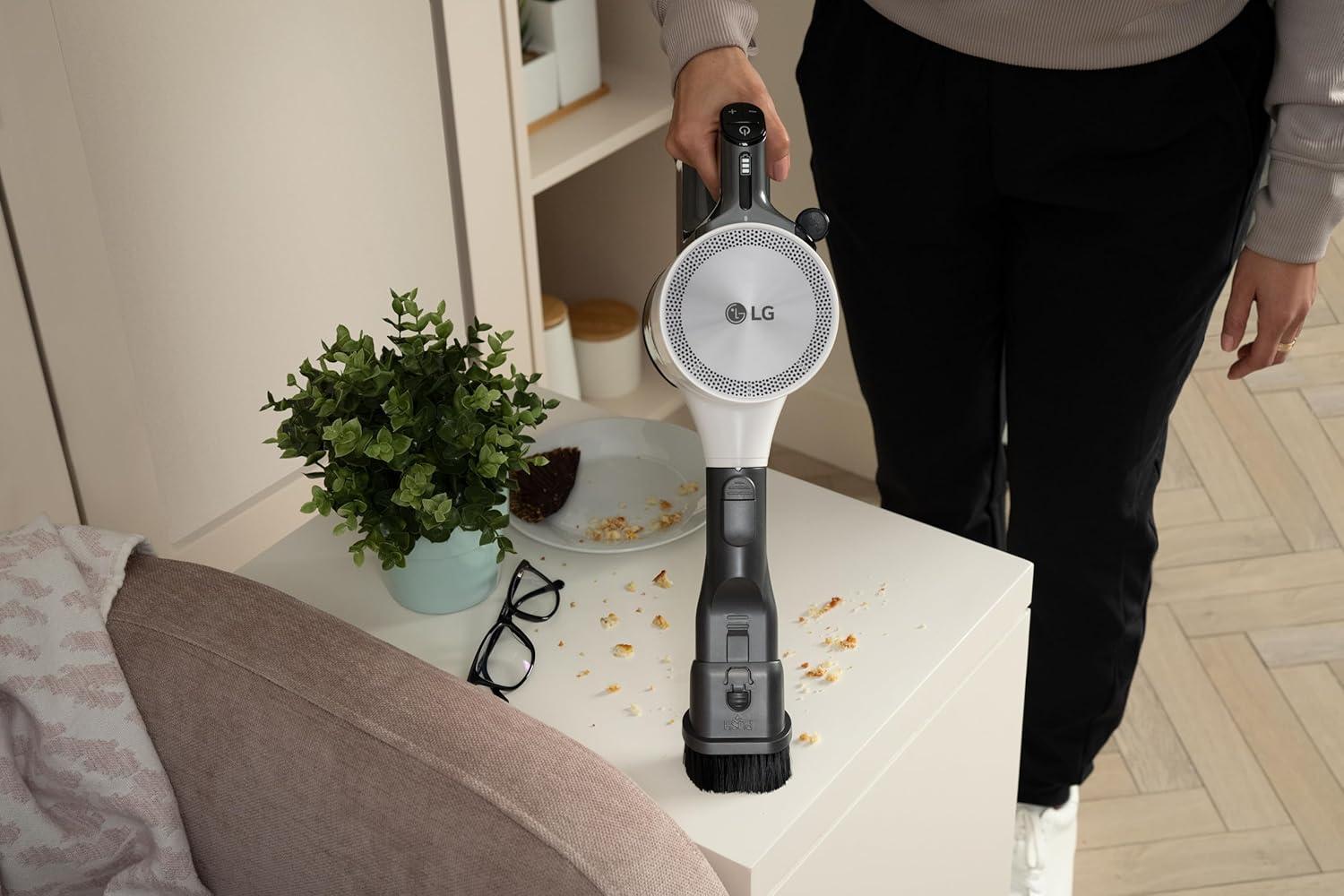 This LG stick vacuum automatically empties the dust bin when docked to keep collected debris out of your home, out of the air-and off of your hands.