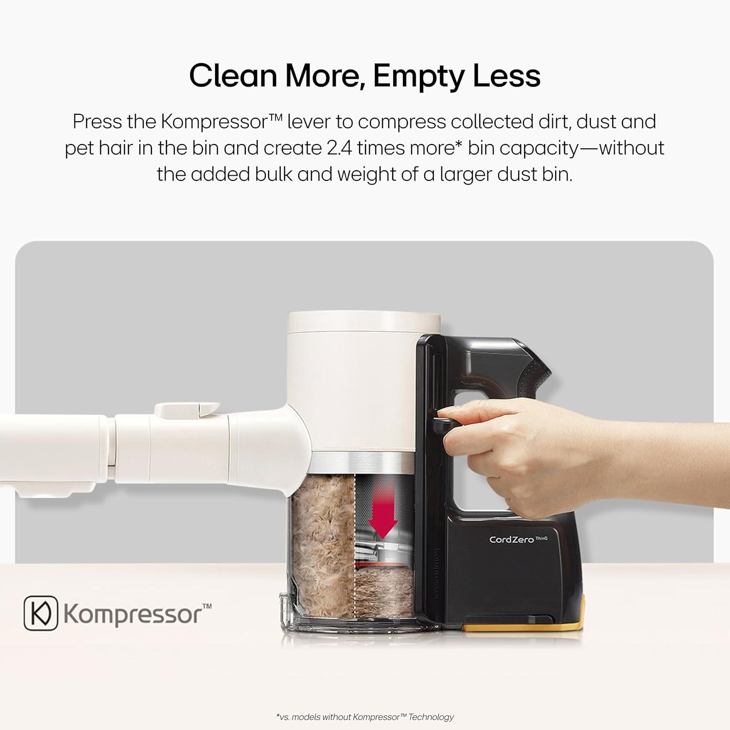 LG Kompressor allows you to compress dirt and dust so you can clean with less stopping to empty the dust bin.