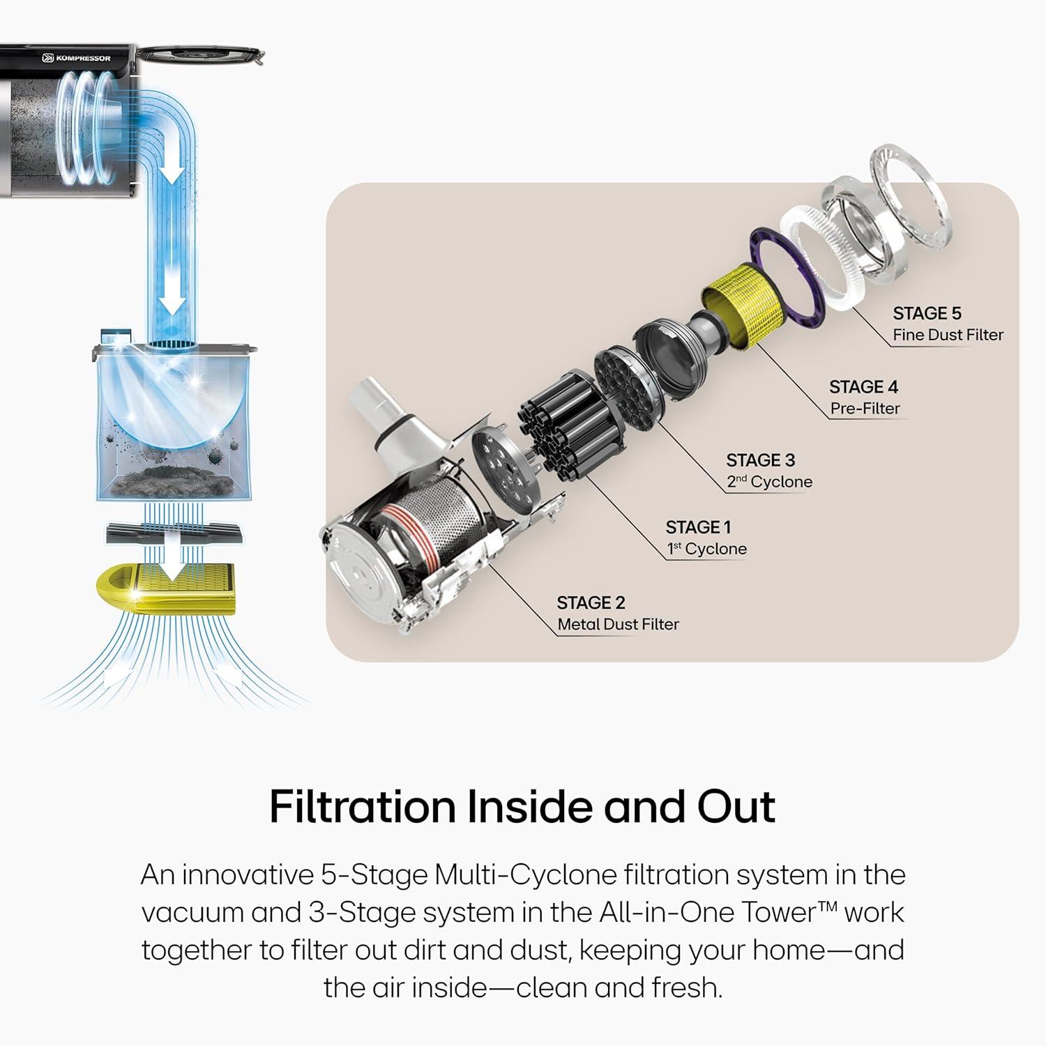 The 5-step system helps to filters dust and dirt, first separating dirt in the bin and then filtering fine dust.