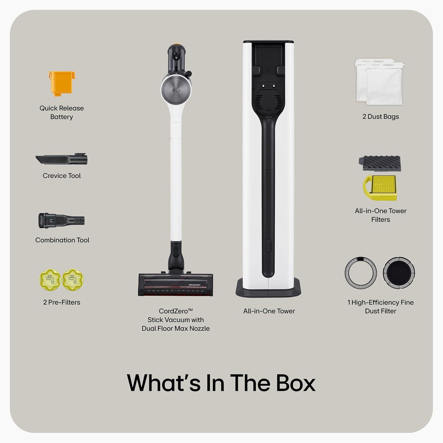 Get hands-on cleaning control and hands-off debris removal with the All-in-One Tower™ that keeps your LG stick vacuum clean, charged and ready to go— automatically. Two quick-release batteries** and Kompressor® technology combine for uninterrupted cleaning power, with multiple tools for cleaning all kinds of surfaces. Return the vac to the tower to recharge, store tools neatly out of sight and let Auto Empty clean out the dust bin for you. Your hands, floor and air stay clean and your CordZero™ vac is ready to go when you need it next.