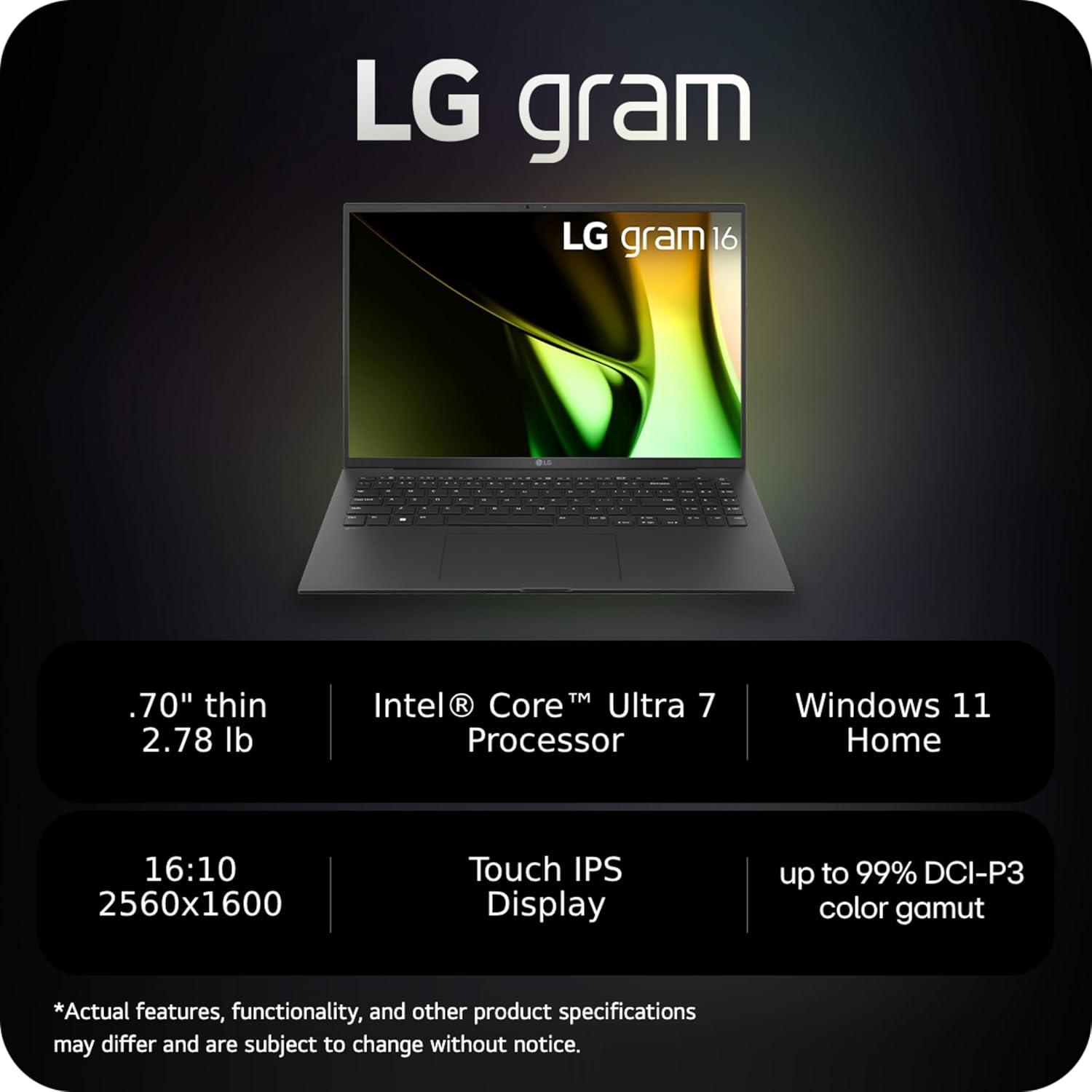 LG gram 16-inch Thin and Lightweight Laptop, Windows 11 Home, AI-Enabled Intel Evo Edition powered by Intel Core Ultra7(Series 2) 255H Processor, 16GB RAM, 1TB SSD, Obsidian Black