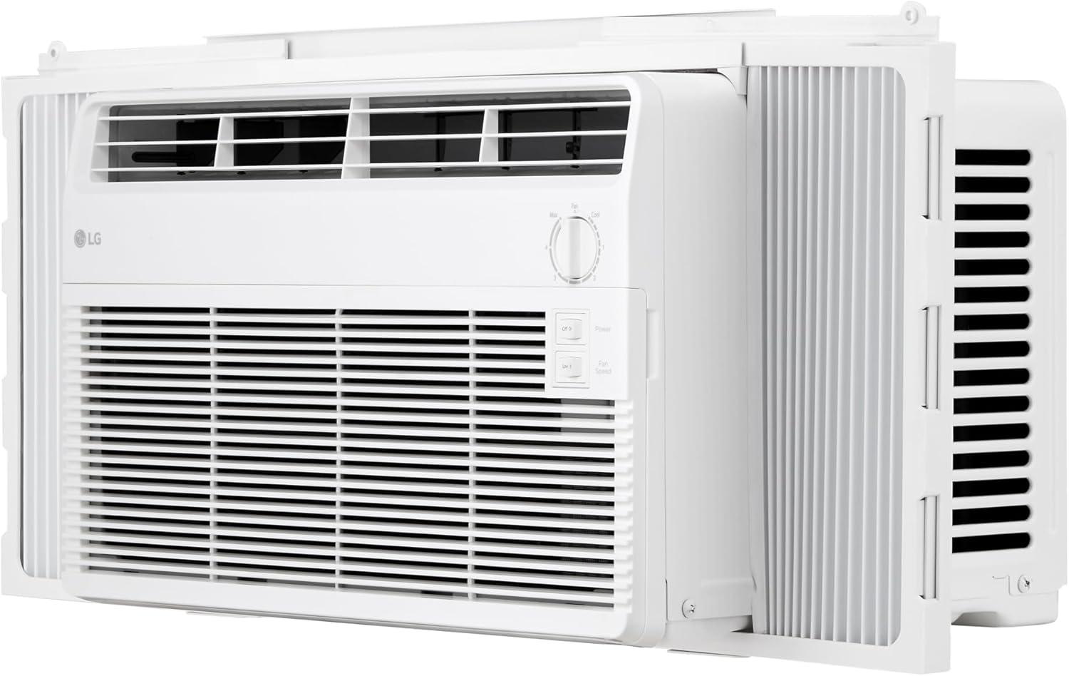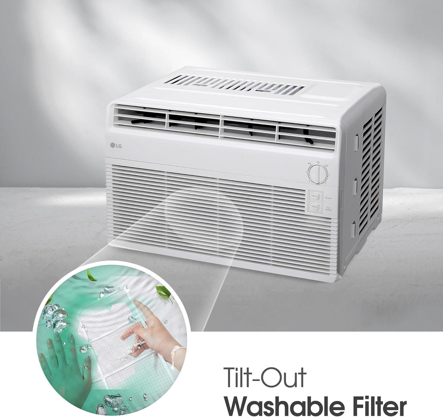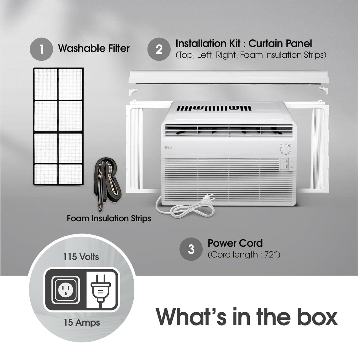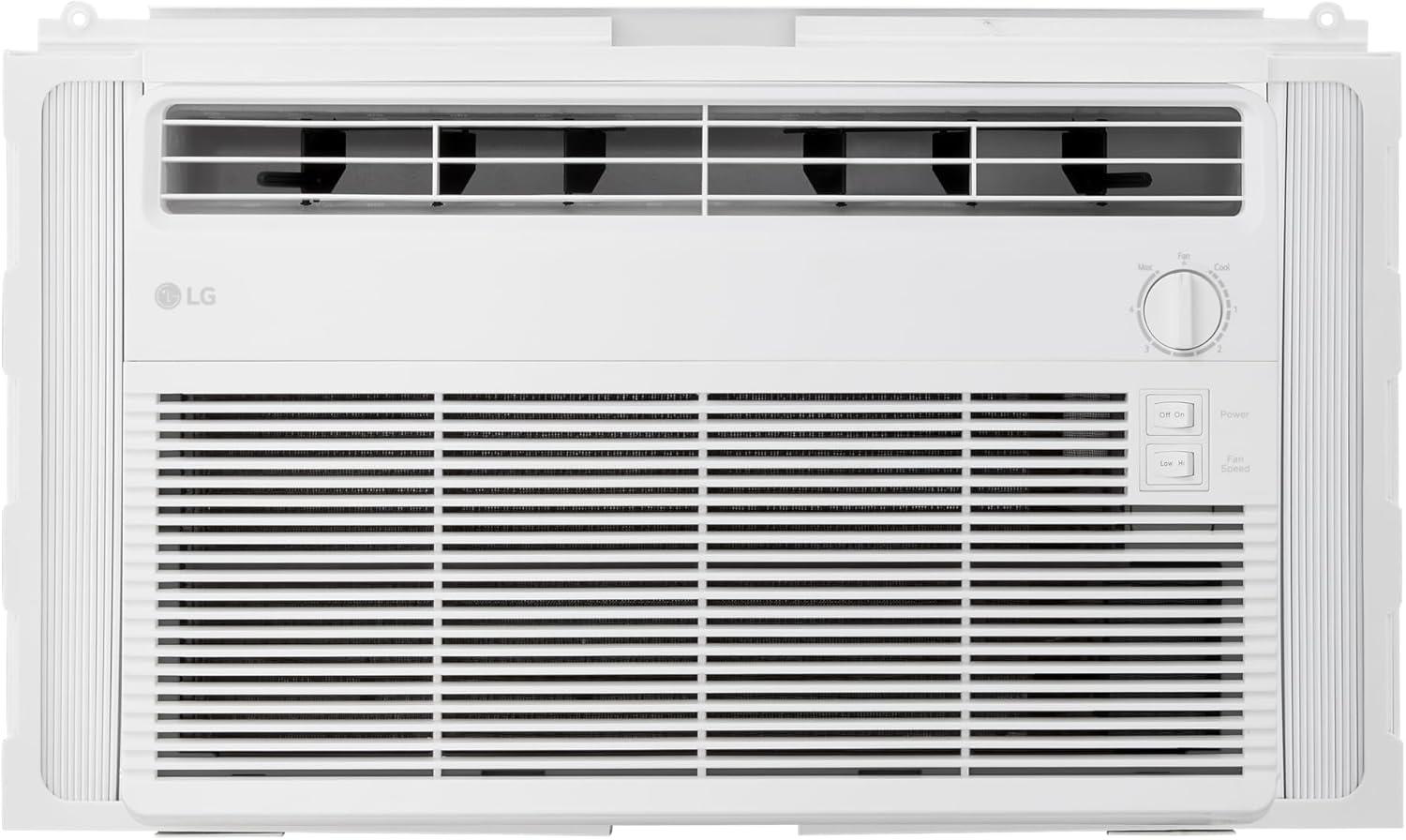 The LG LW5024X is a 5,000 BTU window air conditioner designed to efficiently cool rooms up to 150 square feet, making it ideal for small living spaces such as bedrooms, home offices, or dorm rooms. This unit offers two cooling and fan speeds, allowing you to customize airflow and temperature to your comfort preferences. The 2-way air deflection system ensures even distribution of cool air throughout the room, enhancing overall comfort. User-friendly features include a simple control panel for easy operation. The unit operates quietly, with sound levels as low as 50 dB in low mode, minimizing disruptions to your environment. Additionally, the auto-restart function ensures the unit resumes operation with previous settings after a power outage, providing uninterrupted comfort. Maintenance is straightforward with the slide-out, washable filter, which helps maintain optimal performance and indoor air quality. Installation is simplified with the included installation kit, allowing for quick and hassle-free setup. The LG LW5024X combines efficient cooling, customizable settings, and user-friendly features, making it a practical solution for maintaining a comfortable environment in smaller living spaces.