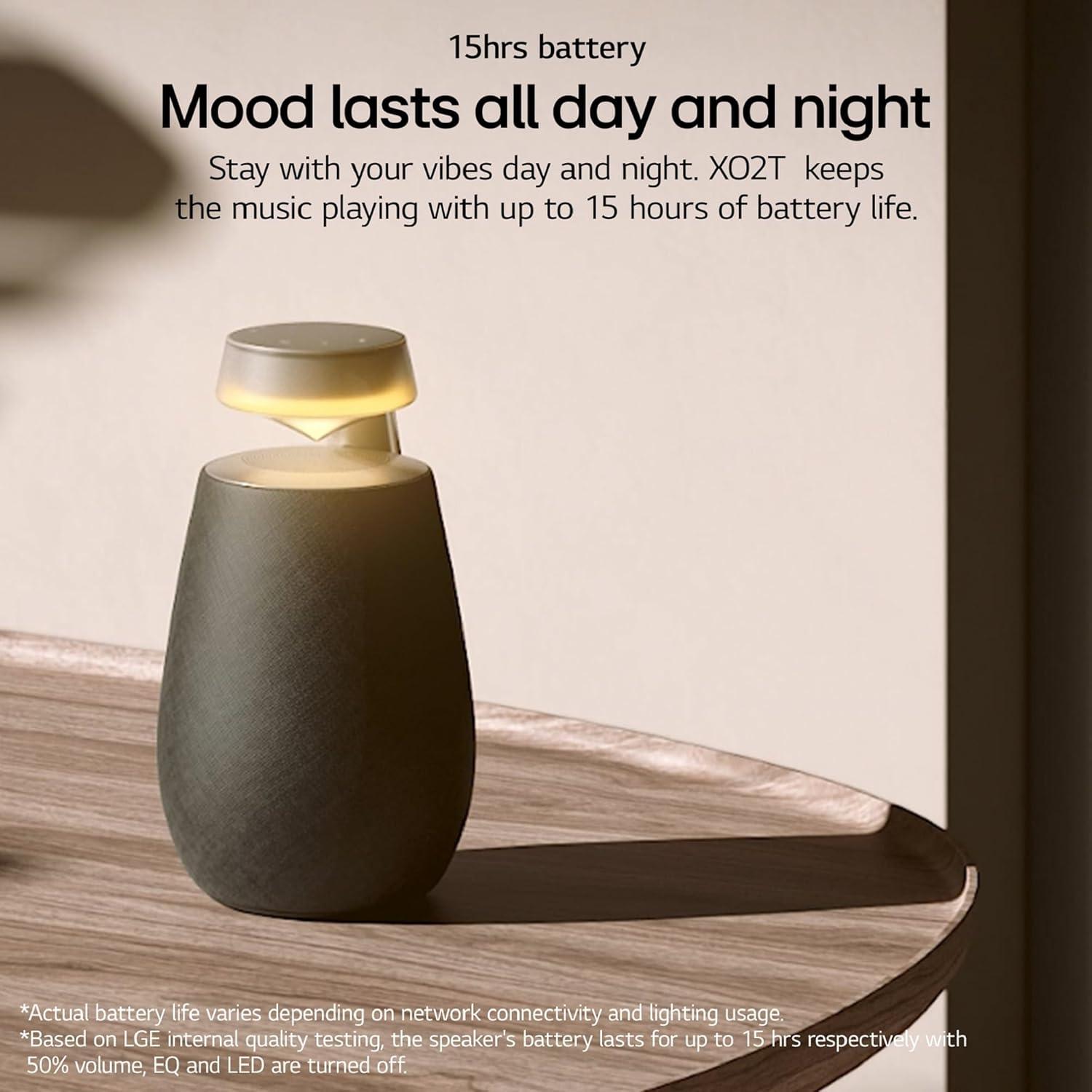 The XO2T lets you hear and feel your music anywhere you are, day or night. Filling spaces with 360° of distortion-free audio, this compact speaker delivers calm, peaceful and clear sound in addition to deep bass. It has crystal-clear tones, even at low volumes and you’ll bask in dazzling mood lighting, customizable for any vibe. ¹Up to 15 hours. Based on internal testing using volume level 50%, Bluetooth on, EQ Standard sound mode, and no lighting. Actual battery usage time and performance may vary depending on network connectivity and application use. ²Tested under controlled laboratory conditions with an IP55 rating under IEC standard 60529. Dust protected and resistant to low-pressure water jet spray from 2.5-3m away for 3 minutes. Dry before using. Do not charge while wet.
